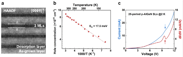 图1.(a)基于“脱附控制超薄层外延”方法制备的自组装p型AlGaN 短周期超晶格。(b)p型AlGaN 短周期超晶格的变温霍尔效应测试结果。(c)p型AlGaN 短周期超晶格中负微分电导效应。