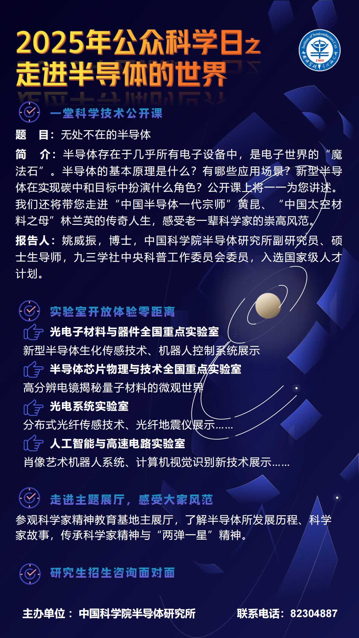 为进一步贯彻习近平总书记关于科普和科学教育工作的重要论述,落实新修订的《中华人民共和国科学技术普及法》要求,展示我所创新成果,塑造良好社会形象,助力提升青少年科学素养,我所决定于2025年5月17日举办公众科学日活动,具体安排如下。