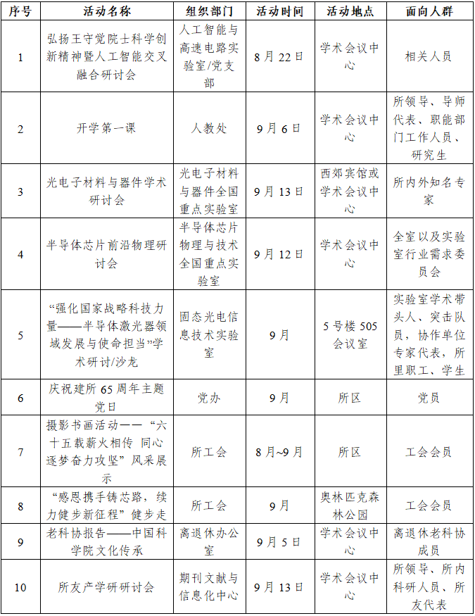 2025年9月6日将迎来半导体研究所成立65周年华诞。为庆祝建所65周年这一重要时刻,进一步凝心聚力、促进发展,研究所设计制作了“所庆纪念标识”,职工、研究生热情参与进行了网上投票。同时,研究所多个部门也将于8月20日至9月20日期间举办丰富多彩的所庆纪念活动。现将“所庆纪念标识”及庆祝建所65周年系列活动安排予以公布,标识可在活动中使用?;队魑恢肮?、研究生广泛关注、积极参与相关活动,让我们与所同行共进,共创美好未来!