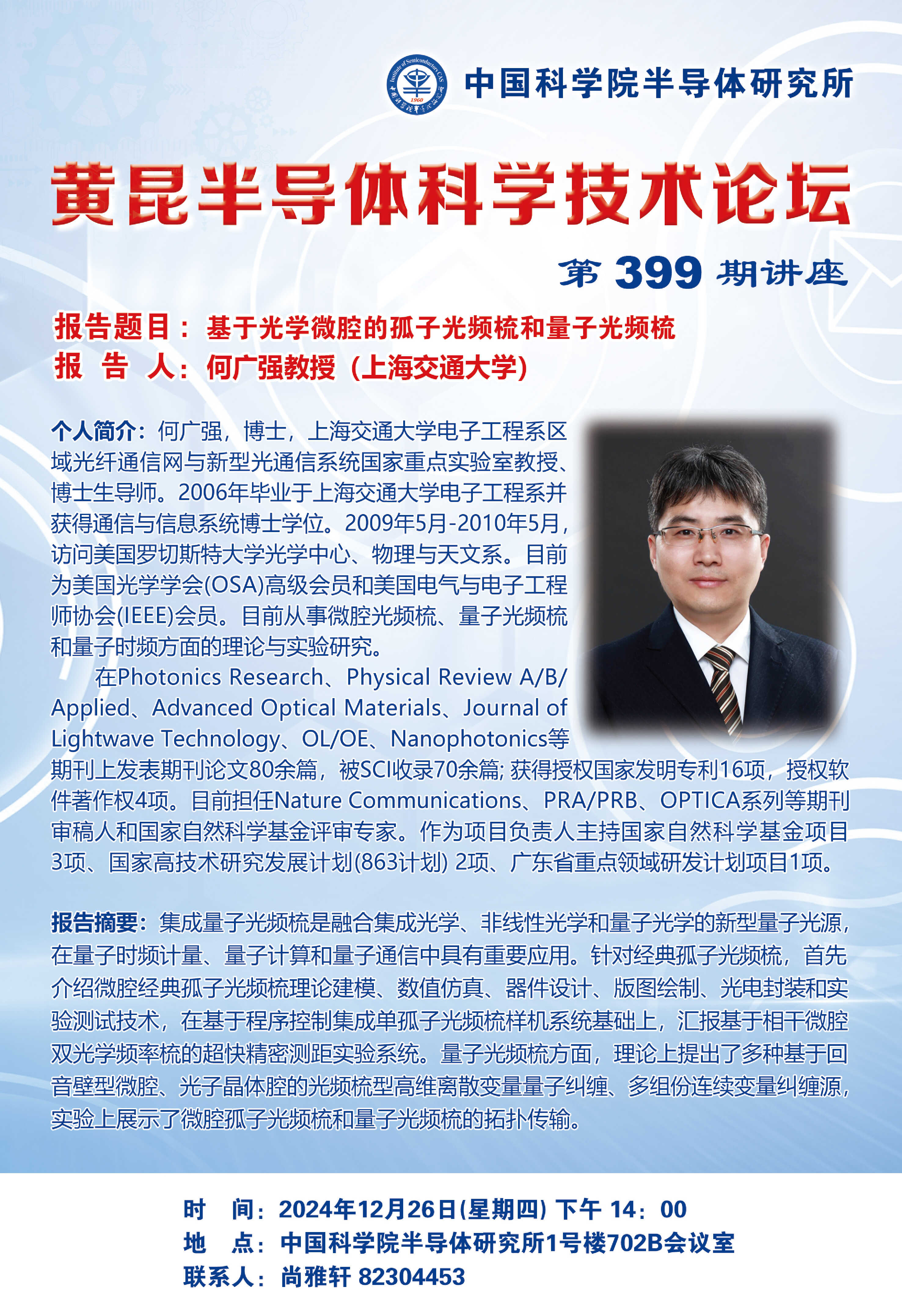[黄昆论坛]第399期:基于光学微腔的孤子光频梳和量子光频梳