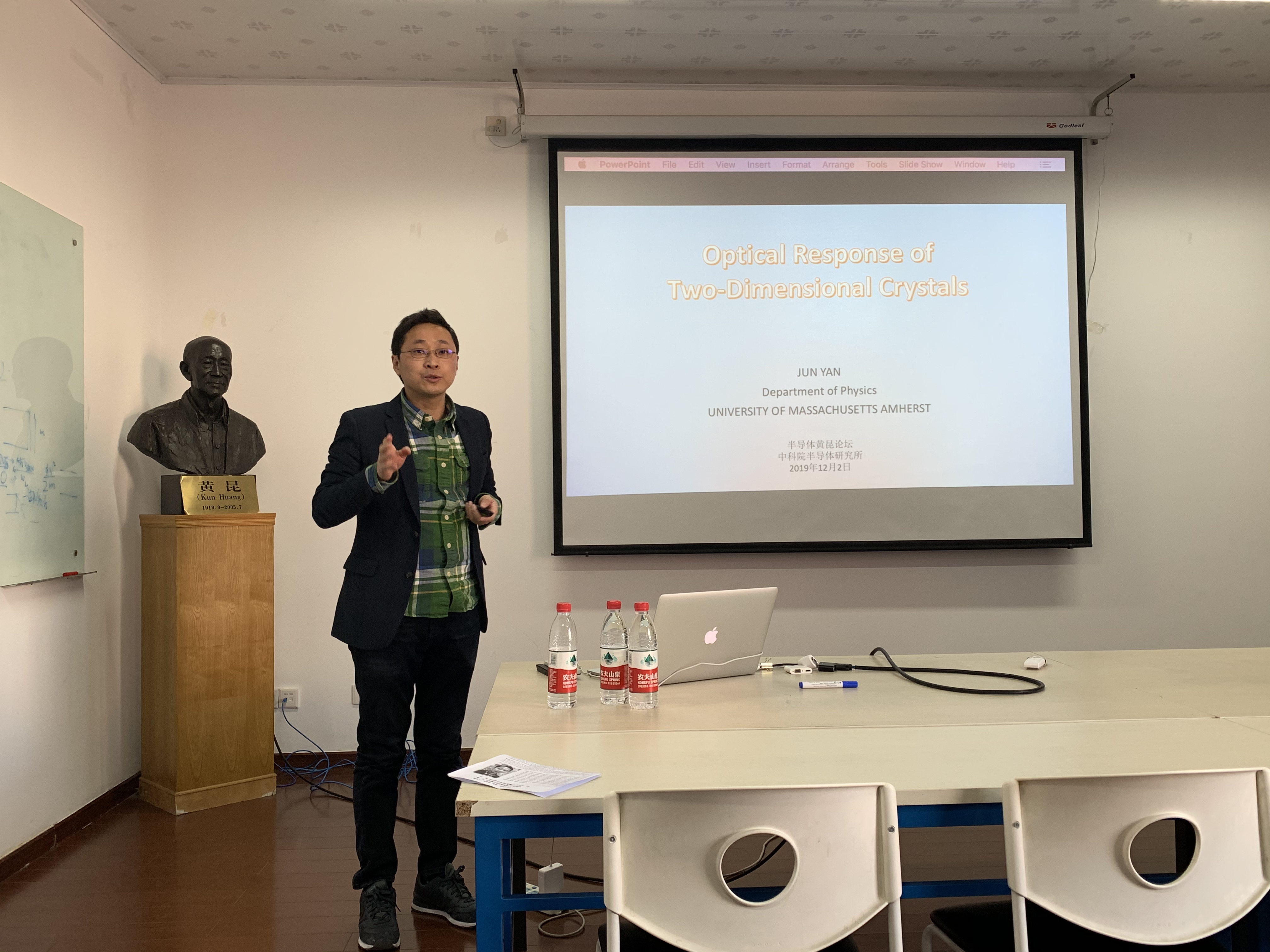 应半导体所副所长(主持工作)谭平恒研究员的邀请, 2019年12月2日下午,美国麻省大学的Jun Yan副教授来半导体所进行学术交流,并在“黄昆半导体科学技术论坛”上作第351期报告。