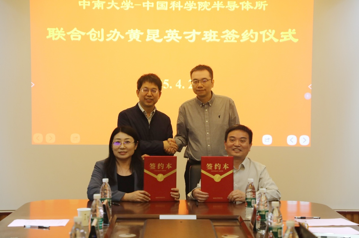 徐艳坤、孙克辉作为双方代表正式签署联合创办“黄昆英才班”协议。随后,谭平恒、何军共同为“黄昆英才班”揭牌。根据协议,“黄昆英才班”将通过在中南大学物理学院相关专业的优秀本科生中进行选拔,通过教师、资源等共享的方式,共同培育具有扎实的专业基础、卓越创新能力的优秀人才。此外,半导体所还设立了“黄昆奖学金”,奖励在“黄昆英才班”中表现优异的学生。