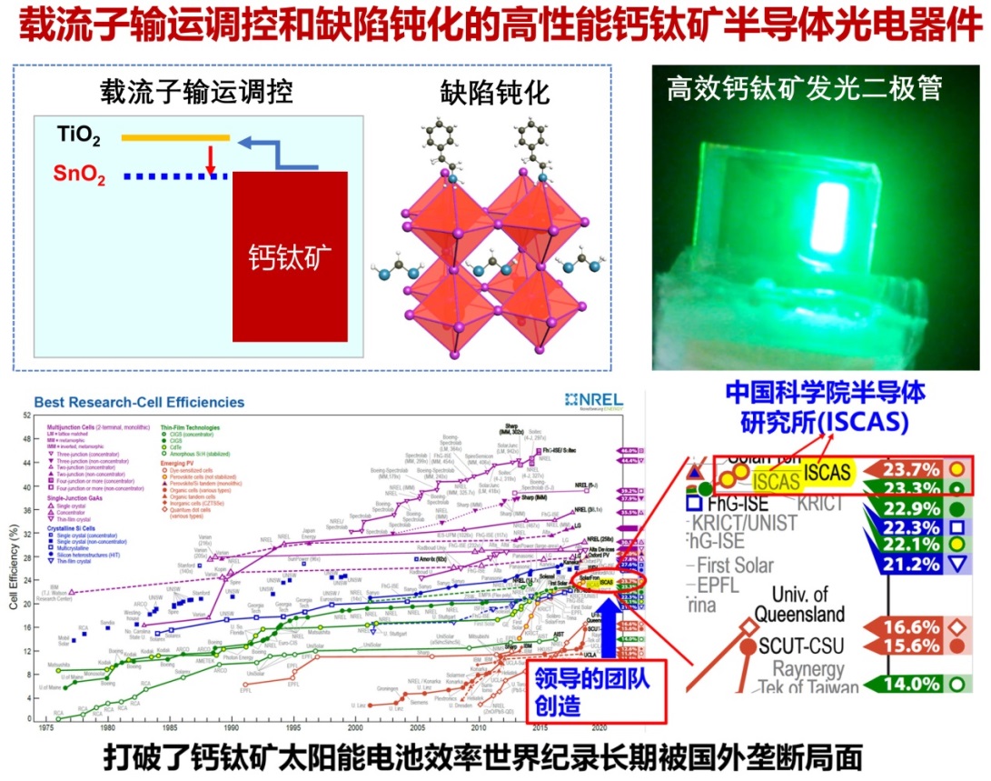 该项目围绕实现钙钛矿半导体器件高效光电/电光转换的关键科学问题开展研究,形成具有国际特色的钙钛矿半导体光电器件研究思路。发现了普适的电子传输层氧化锡,消除了钙钛矿/电子传输层界面势垒及电荷积累,解决了钙钛矿太阳电池中广泛存在电滞的关键瓶颈问题。提出了分子尺度钝化钙钛矿表面缺陷的思路,连续两次创造了钙钛矿太阳电池效率的世界纪录(23.3%,23.7%),被美国可再生能源国家实验室发表的“Best Research Cell Efficiency”收录,实现了中国团队在此领域世界纪录效率的突破,打破了钙钛矿太阳电池效率纪录长期被国外垄断的局面,被Nature Energy发表的“钙钛矿光伏十年”社论重点评述。在国际上较早开展钙钛矿发光二极管研究,通过载流子注入平衡调控以及与载流子限制效应协同等,研制出当时发光效率最高的钙钛矿发光二极管,在发光二极管方面的研究成果也多次被同行评价为“创纪录”的发光效率。