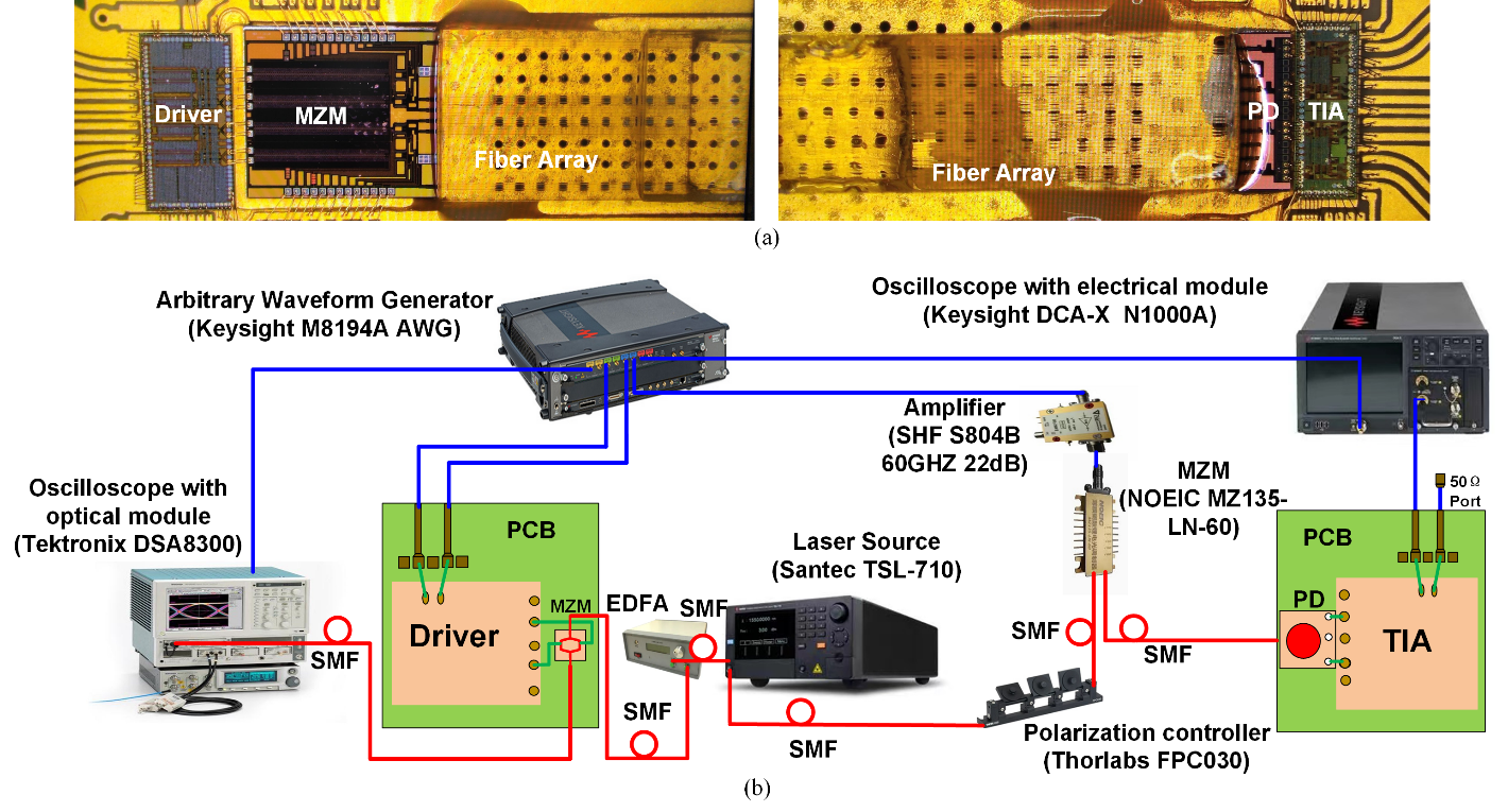 该研究团队通过四通道集电极开路的驱动器与阵列化的行波MZM协同设计,实现了高带宽和高驱动效率,还提出了一种二阶混合无源-有源CTLE,用于补偿高达12dB的非线性信道损耗。此外,该团队还提出了一种带有T-π输入网络和级联内嵌式CTLE的线性TIA,可在保持平坦带内频率响应的同时提高带宽。该驱动器和TIA采用180nm SiGe BiCMOS工艺实现,测量结果显示其带宽超过35GHz。通过将驱动器与MZM、TIA与PD共同封装,构建了完整的硅基光电集成收发机前端(图2为光发射机和光接收机的封装照片,图3为实验结果)。电光调制和光电接收均可实现400G速率的应用需求。光发射机实现了5dB的光消光比和4.8pJ/bit的功耗效率,而光接收机实现了67dB的跨阻增益和2.95pJ/bit的功耗效率。