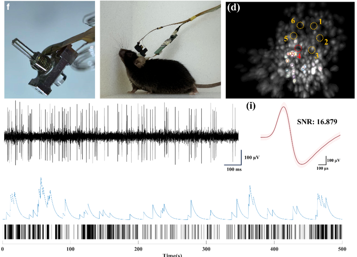 针对自由活动动物神经活动记录高空间分辨和高时间分辨难以同步实施的难题,研究团队通过独特的光电材料复合设计和柔性电极工艺,成功实现了透明电极与迷你头戴式荧光显微镜的无缝集成,集成的光电神经接口器件植入小鼠大脑后几乎不影响小鼠的自由活动,通过对单个神经元电发放和群体神经元荧光钙离子光成像的同时双模记录,实现了对神经元环路的高时间分辨和高空间分辨的同步记录,为解析神经回路动态提供了一种创新工具(图1)。