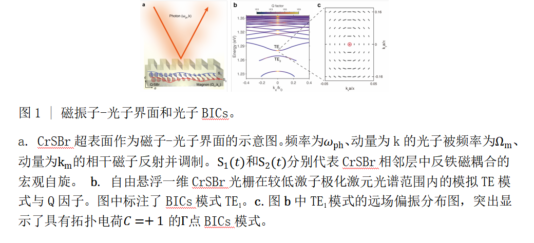 电子自旋可携带非易失的量子信息,是量子信息处理与存储的重要自由度。将自旋态与光子相连接,可实现自旋量子信息的远距离传输与探测,自旋-光子界面因此成为构建可扩展量子网络和连接分离量子节点的关键基础。传统自旋-光子界面的研究主要集中在非磁性半导体量子点、二维过渡金属硫族化合物以及缺陷自旋体系中。尽管磁性材料是当代自旋电子研究和存储行业的支柱,但受限于光学不活跃的带边跃迁、光学性能下降以及有限的自旋弛豫和相干时间,其自旋-光子界面研究相对不足。新近发现的二维磁性半导体(如CrSBr)兼具强光-物质相互作用与磁-电子耦合效应,为这一领域带来了新机遇。此外,磁振子作为磁性材料中独特的集体自旋激发,在CrSBr中已被证明能够与激子态强耦合并在超快时间尺度上调制光学响应。然而,现有研究主要集中在无结构样品和动量积分测量中,磁振子-光子耦合在光子结构中的增强机制及其动量相关物理机制仍有待深入探索。