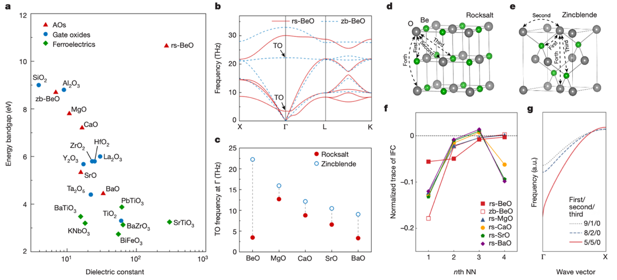 通过晶体管持续小型化提升集成度的摩尔定律已接近物理极限,主要瓶颈是晶体管功耗难以等比例降低。进一步降低功耗有两个主要途径:其一是寻找拥有比HfO2?更高介电常数和更大带隙的新型高k氧化物介电材料,确保不降低栅控能力的前提下增厚栅介电层,遏制量子隧穿效应引起的栅极漏电流;另一个是采用铁电/电介质栅堆叠的负电容晶体管(NCFET),突破传统晶体管室温60 mV/dec的亚阈值摆幅限制,进而实现更低的工作电压和功耗。氧化物高k介电常数和铁电相变都源于光学声子软化。通常认为,只有当Born有效电荷足够强使得长程库伦作用超越短程原子键强度时,才会出现光学声子软化,但这会导致材料的介电常数与带隙成反比,难以同时拥有高介电常数和大带隙。此外,铁电材料受限于强Born有效电荷引起的界面退极化效应,难以应用于大规模集成的纳米尺度器件。