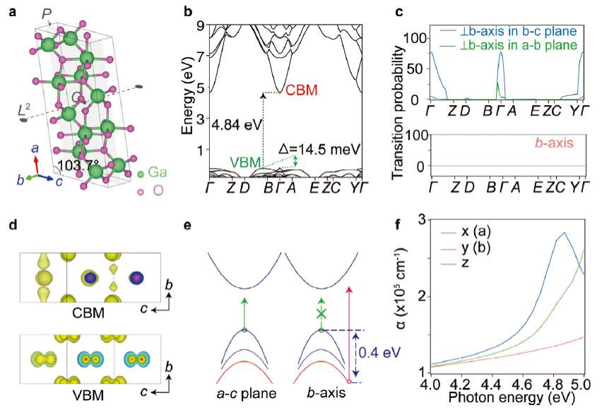 该工作首先从电子跃迁概率上理论分析了β-Ga2O3实现各向异性日盲紫外偏振光吸收与响应的物理机制(图1)?;谏桃祷?em>β-Ga2O3单晶衬底制备出偏振光探测器,通过使用不对称电极材料(Ti/Au和Pt/Ti/Au)的肖特基光电二极管结构,在肖特基势垒处形成的内置电场获得明显的整流特性。实验上发现,基于(010)和(001)晶面β-Ga2O3的光电探测器对日盲紫外光均表现出偏振角依赖性,偏振光电各向异性比分别为1.2和5.8。经归一化处理后,发现β-Ga2O3沿不同晶轴的偏振光电流之间关系为c轴>a轴>b轴,与理论分析的光跃迁概率关系一致。该器件不用受常规紫外偏振片技术加工难点的限制,有效实现了日盲紫外波段的偏振光吸收与探测。