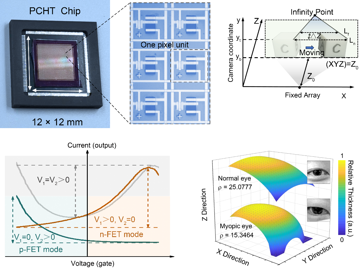 光电异质结晶体管阵列采用四端架构阵列设计实现动静态物体形态感知与记忆,并利用视差原理构建深度场重构方法,基于尺度不变特征转变(SIFT)的快速检测算法,对光电异质结集成阵列感知记忆的物体运动信息进行三维重构。该光电异质结晶体管集成阵列能够实现物体的多视角三维形态重构、二维深度场映射以及多视角耦合重构等功能。此外,研究团队利用该光电异质结集成系统实现对眼球形态的感知与重构,验证了该系统的三维重构功能在眼球角膜病变检测的应用可行性。