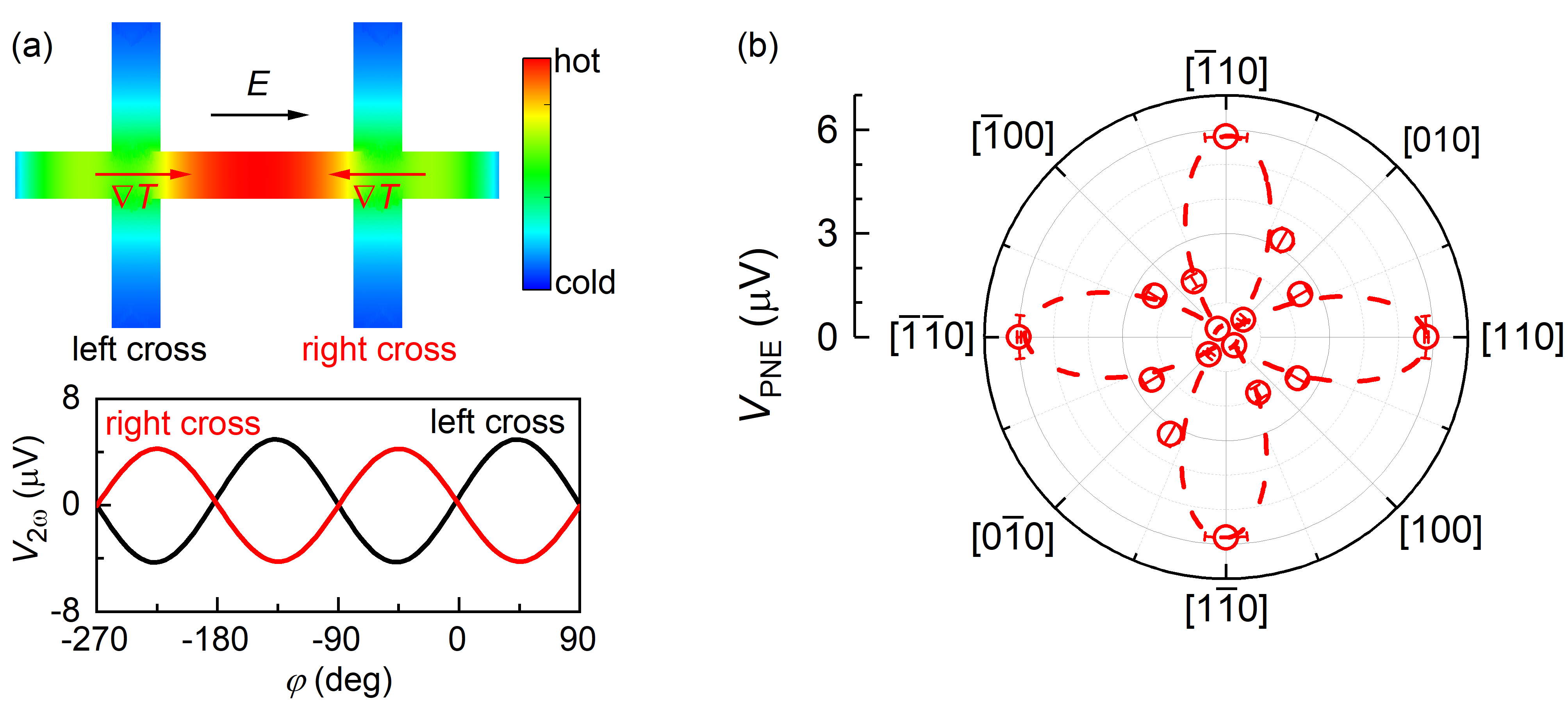 1. a)双十字霍尔器件中的平面能斯特效应;(bCoFe (001)平面能斯特电压的各向异性。
