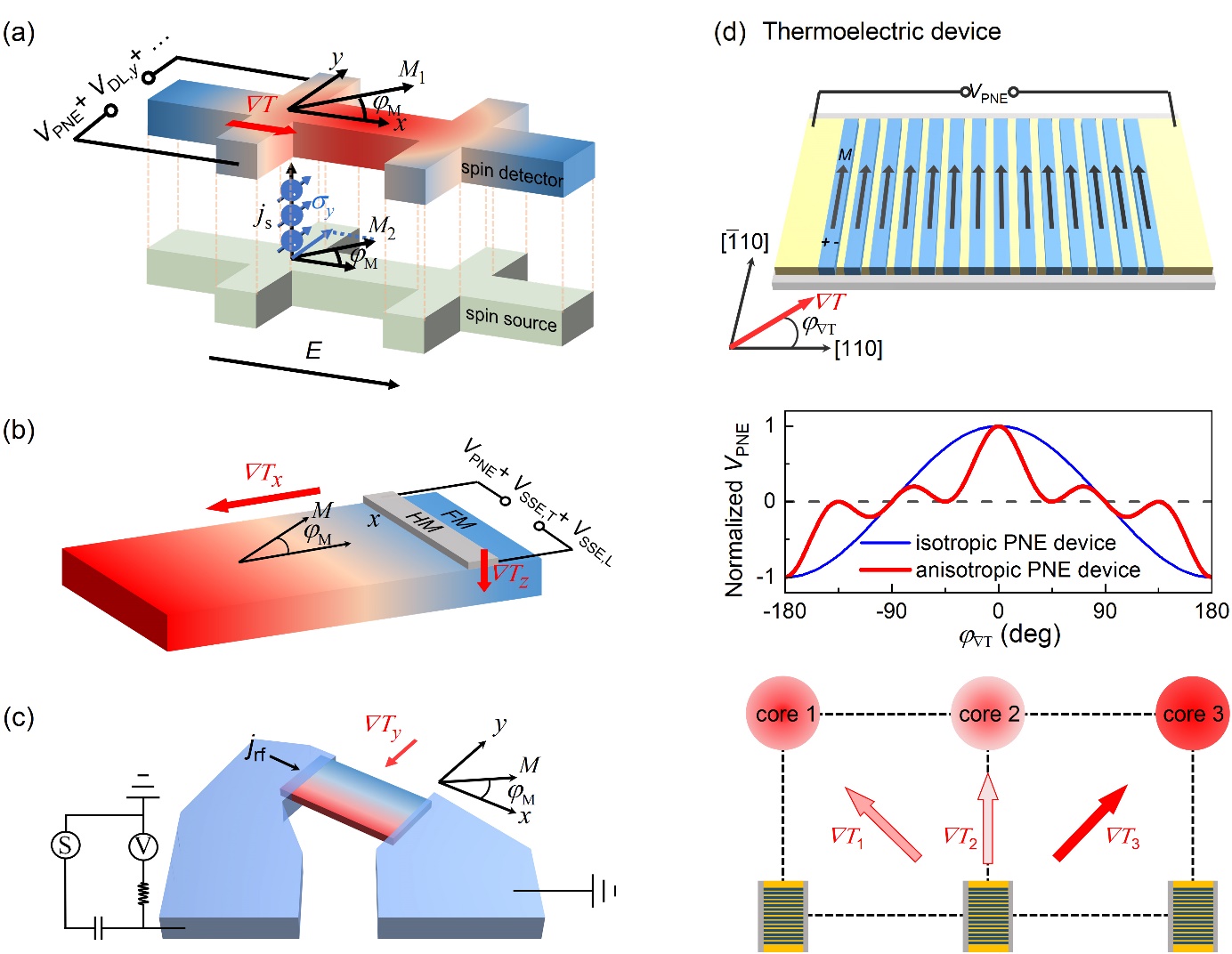 2. 各向异性平面能斯特效应对(a)谐波霍尔电压、(b)自旋塞贝克、(c)自旋扭矩-铁磁共振等自旋电子实验的广泛影响及其在(d)热电器件方面的应用案例。