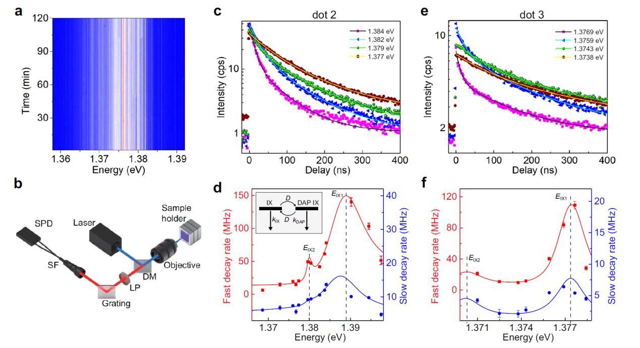 图2,局域IX发射的寿命能量关联。(a) IX荧光光谱随时间变化。(b)实验装置。(c-f)?能量和时间分辨的局域IX发射,及对应的衰减速率和能量的关系。?