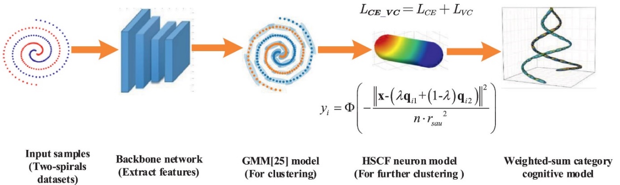 受生物认知机制的启发,中国科学院半导体研究所高速电路与神经网络实验室李卫军研究员团队设计了一种具有高度柔性与可塑性的超香肠覆盖式神经元模型(HSCF neuron)(如图1所示)。研究团队定义了一种新的交叉熵和体积覆盖率损失函数,该损失函数可最大限度地压缩超香肠的体积,从而确保样本的类内紧凑性。研究团队引入了一种分裂迭代方法,将每个神经元模型视为一个弱分类器,并迭代增加弱分类器的数量,该迭代方法可自适应地确定HSCF神经元的最优数量,形成了端到端的学习框架(如图2所示)。最后,研究团队在模式识别领域的八个经典数据集上进行的对比实验和消融实验证明了该方法的有效性。超香肠覆盖式神经元模型可以应用于经典的DNN中以解决多种模式识别问题,具有广泛的应用与学术价值;此外,所提出的方法也证明了利用神经元可塑性增强DNN性能的可行性,为DNN的进一步发展提供了新的视角。