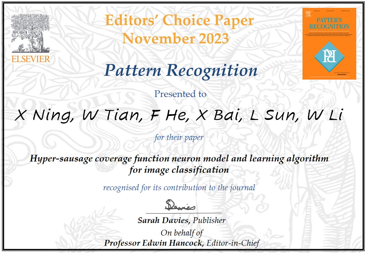 该研究成果近日以“Hyper-sausage coverage function neuron model and learning algorithm for image classification”为题发表于模式识别领域TOP期刊《Pattern Recognition》(136 (109216), 2023), 文章发表后相继入选ESI热点与ESI高倍引论文,并入选期刊2023年Editors' Choice Paper(如图3所示)。论文第一作者为半导体所宁欣副研究员,通讯作者为李卫军研究员。本工作得到国家自然科学基金委项目的支持。
