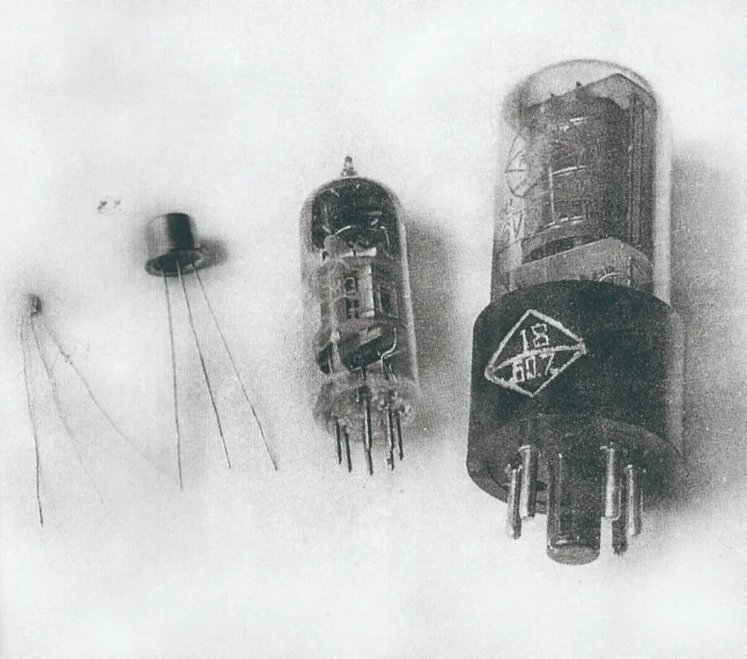 半导体研究室早期研制的硅平面晶体管(芝麻管,左一),右一为普通电子管。
