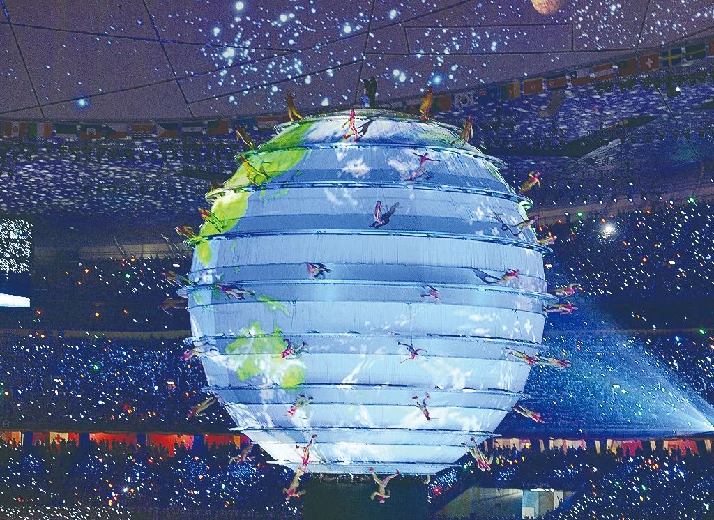 华表的影像流淌在徐徐展开的巨大卷轴上,“飞鸟”和“鲸鱼”自由翱翔在“鸟巢”上空,人类在冉冉升起的蔚蓝色星球上漫步,闪烁的星空变幻成通体晶莹的“鸟巢”。