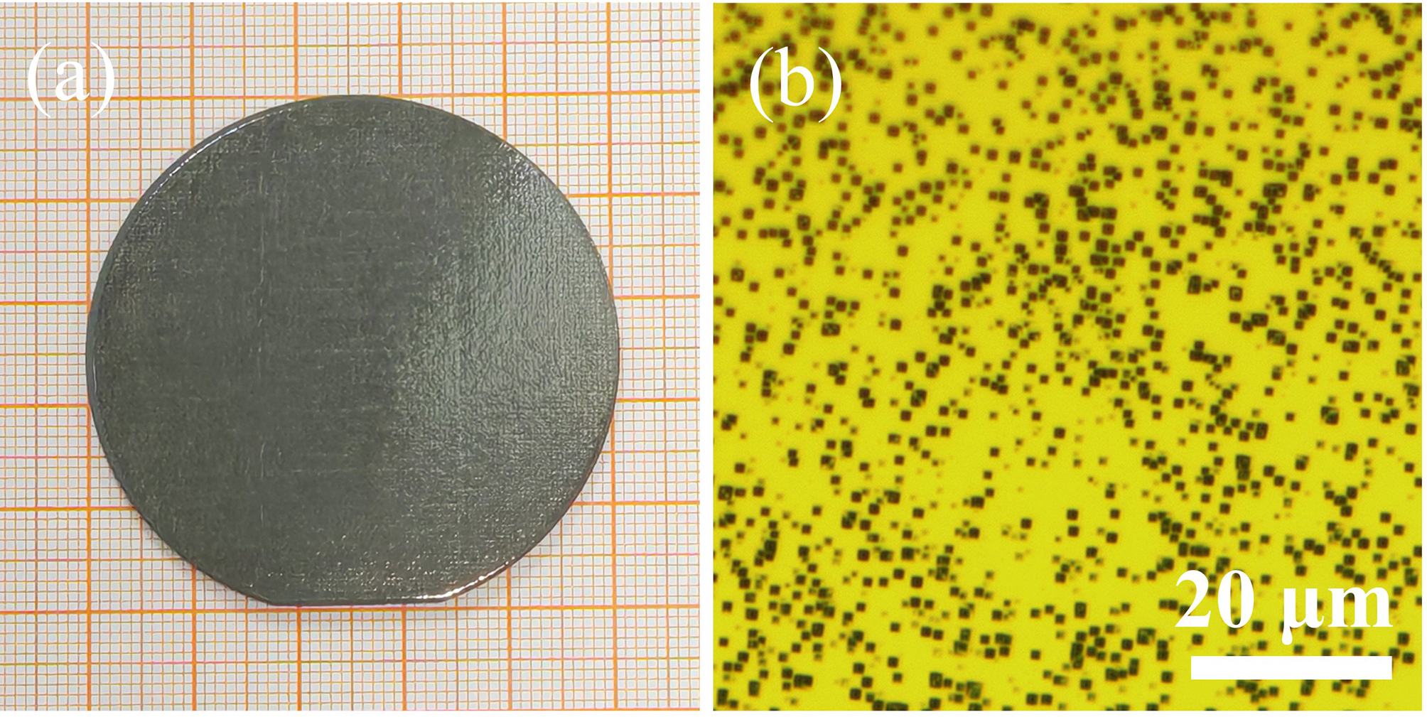 图3. (a) 2 英寸自支撑金刚石单晶照片 (b) 等离子蚀刻后金刚石表面的刻蚀坑显微图像。
