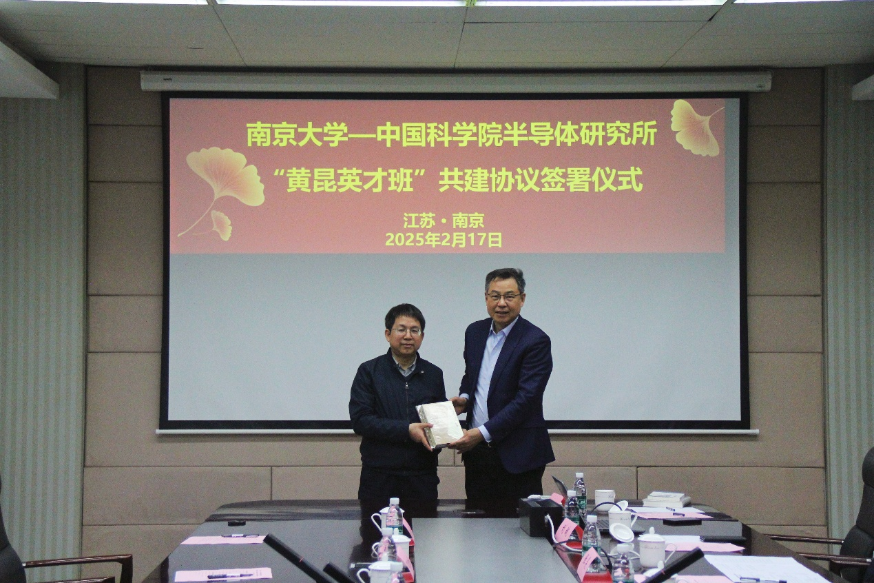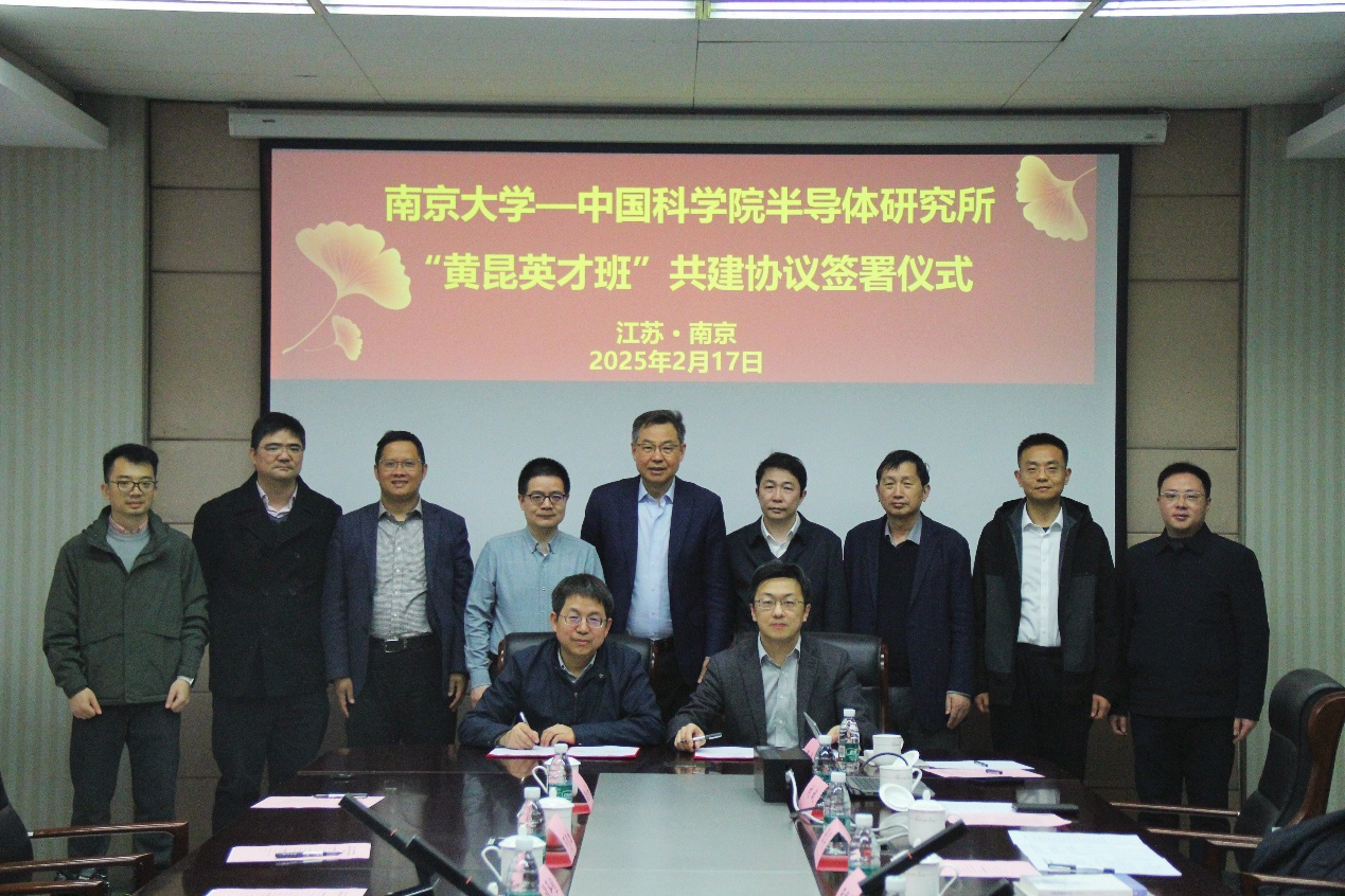 为全面贯彻落实习近平总书记关于加强基础学科人才培养的重要讲话精神、党中央关于统筹推进教育科技人才体制机制一体改革的重大决策部署,以及中国科学院关于加强科教融合、科教结合联合培养本科生的行动计划精神,同时也是为了落实2024年中国科学院与南京大学达成的战略合作框架协议精神,实现与高等院校的优势互补,加快创新拔尖人才培养,2025 年 2 月 17 日,中国科学院半导体研究所和南京大学在仙林校区电子楼会议室举行了联合共建“黄昆英才班”合作协议签约仪式。半导体所所长谭平恒、南京大学党委常委、副校长王振林出席仪式,南京大学电子科学与工程学院党委书记张昊、示范性微电子学院院长施毅、电子科学与工程学院院长刘斌、集成电路学院党委书记兼执行院长王欣然以及匡亚明学院等相关学院的领导和教师代表,以及半导体所魏钟鸣、邓惠雄、魏大海、吴江滨等教师代表参加签约仪式。仪式由南京大学电子科学与工程学院党委书记张昊主持。