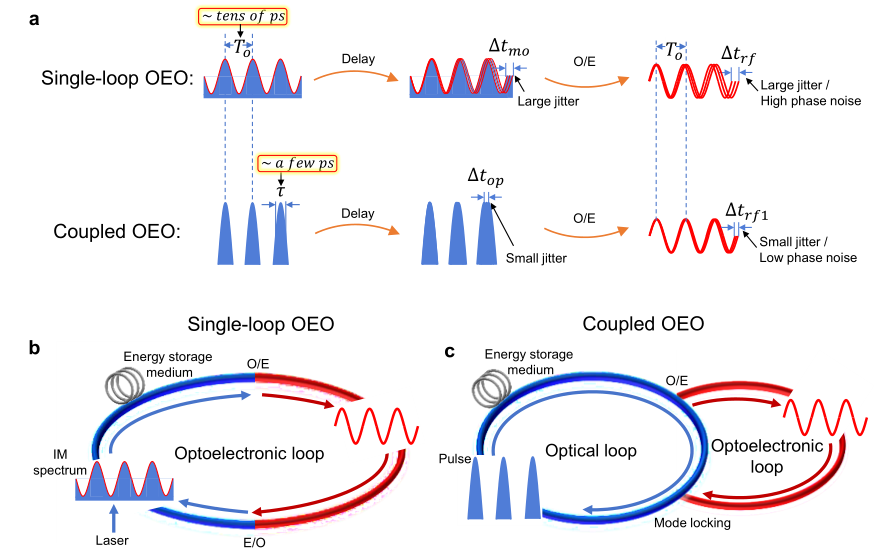 图1 (a)传统单环OEO与耦合式OEO产生微波信号的时间抖动;