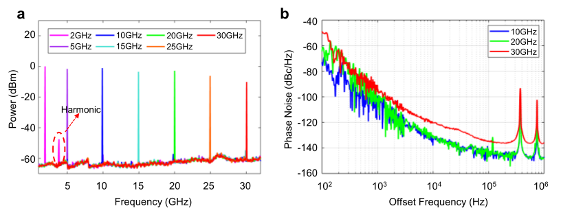 图2(a)集成化耦合式OEO的可调谐输出频谱,(b)不同中心频率处的相位噪声特性