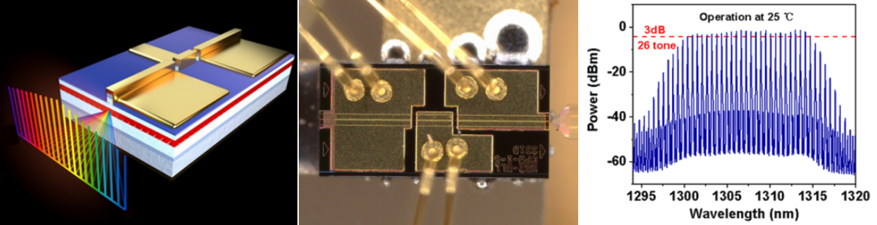 (左)锁模光频梳示意图;(中)光频梳器件结构图;(右)室温下26个通道的光谱图